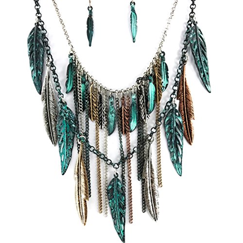 Bohemian Tritone Tassels Metal Feathers Necklace with Earrings